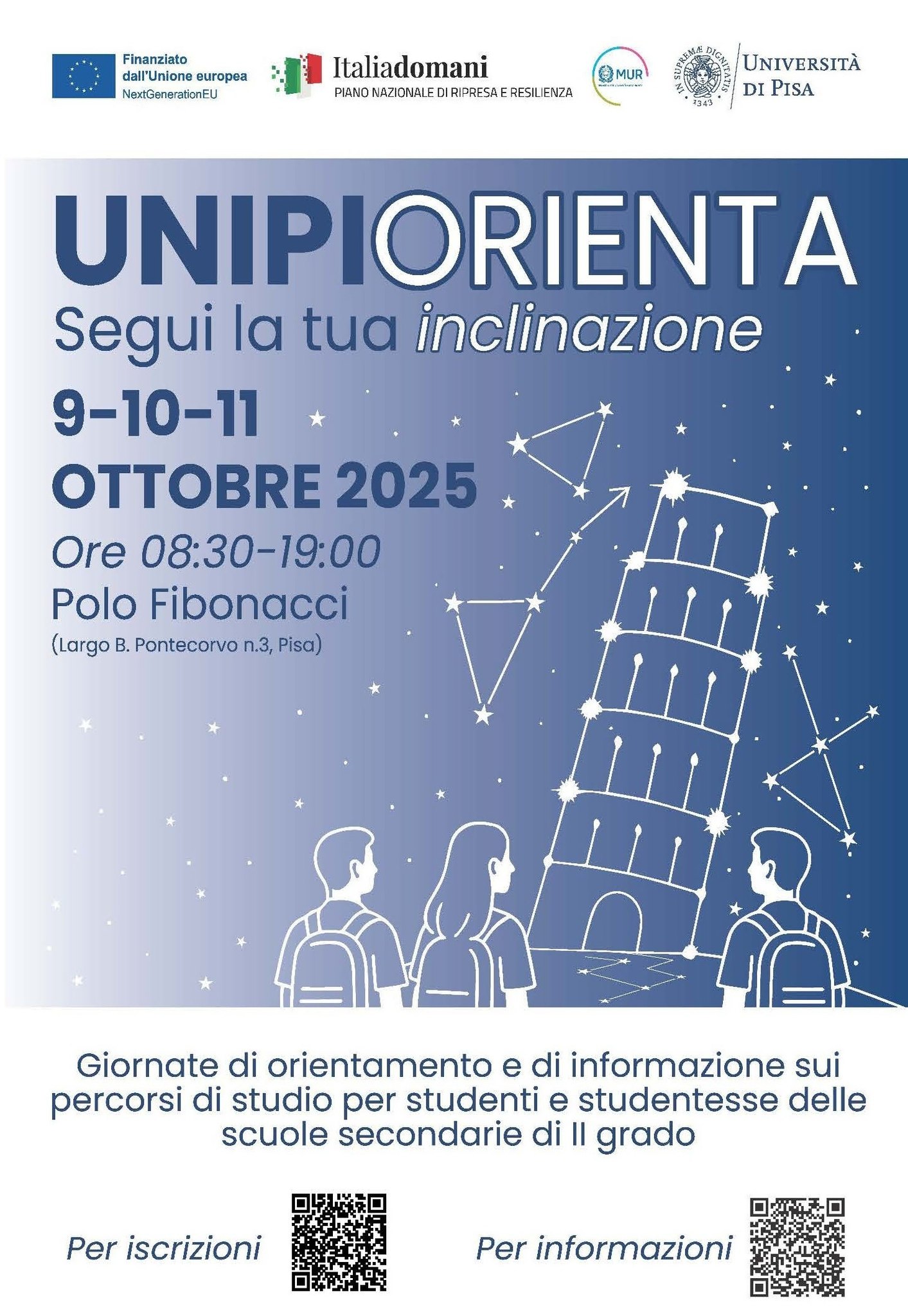 Il nostro personale sarà presente con un proprio stand giovedì 9, venerdì 10 e sabato 11 a partire dalle ore 9:00 e fino alle ore 19:00 al Polo Fibonacci (Largo Bruno Pontecorvo n. 3, Pisa) per fornire informazioni alle studentesse e agli studenti, ai loro familiari e ai docenti che accompagneranno le classi sui suoi 9 musei, ma anche per giocare con loro.